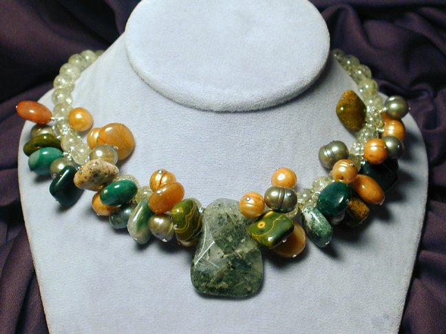 freshwater pearls, green goldstone, and Czech glass seed beads, all