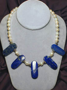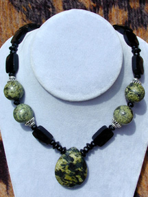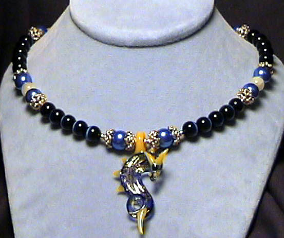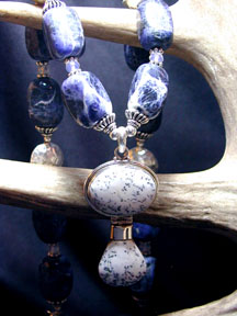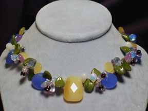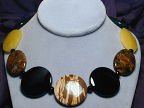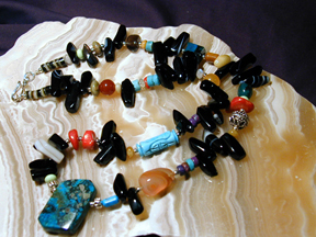 night blossoms. Here black onyx, yellow jade, snowy white quartz, blue