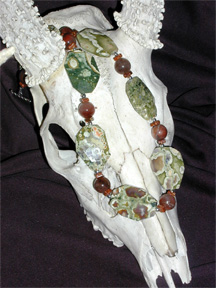shell, moonstone, gaspeite, amber and chrysocolla together with tiny