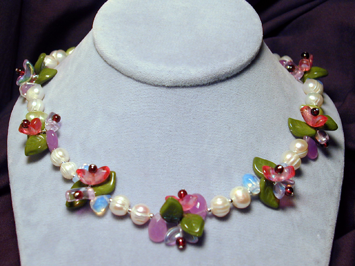 flowers, Czech glass leaves, dangling freshwater white pearls and