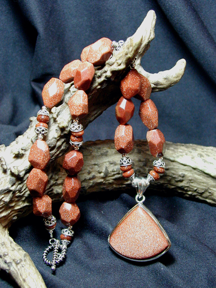 Goldstone nuggets and rondelles join with sterling silver rounds and