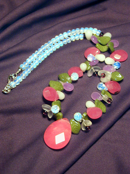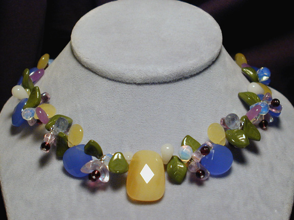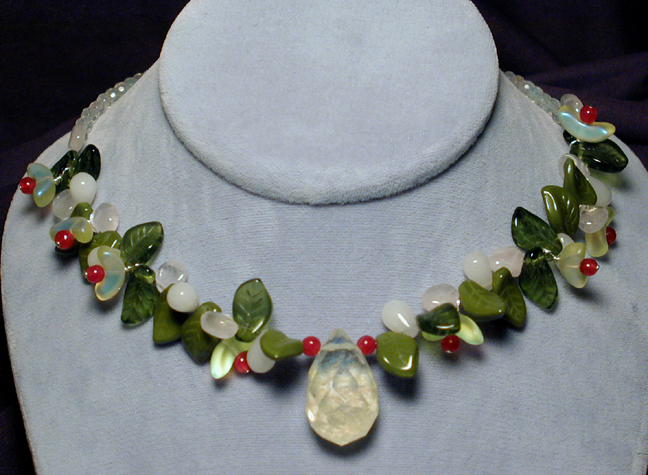 briolettes. Mixed among them are green Czech art glass leaves, and