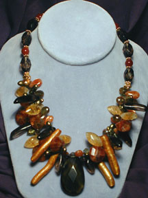 fingers of smoky quartz and gold coral, and iridescent olive biwa